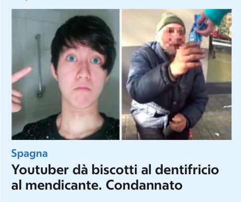 Se cercate di visualizzare mentalmente il termine “testa di cazzo” guardate la faccia da scemo sulla sinistra: Kanghua Ren è il nome di questo imbecille senza pari in galassia. Essendo youtuber e dovendo soddisfare le aspettative degli idioti che lo seguono per discendere sempre più verso il fondo del baratro dove regna l’essenza dell’imbecillità, questo scarto umano ha confezionato un video dove regala ad un povero barbone biscotti ripieni, non di crema bensì di dentifricio. Lo hanno però acchiappato, condannandolo a quindici mesi di prigione, ventimila euro da dare alla persona vittima del suo infimo gesto e la chiusura di ogni canale, sito e quant’altro per cinque anni. Alla faccia della sua espressione da famigerato coglione!