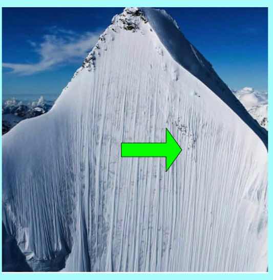 La freccia indica Jèrèmie Heitz, lo sciatore che è sceso da un leggerissimo, impercettibile pendio sul monte Ober Gabelhorn (mt 4063) nelle Alpi Pennine in Svizzera. Peccato, ero sceso mezz’ora prima, per poco non ci siamo incontrati!🤓