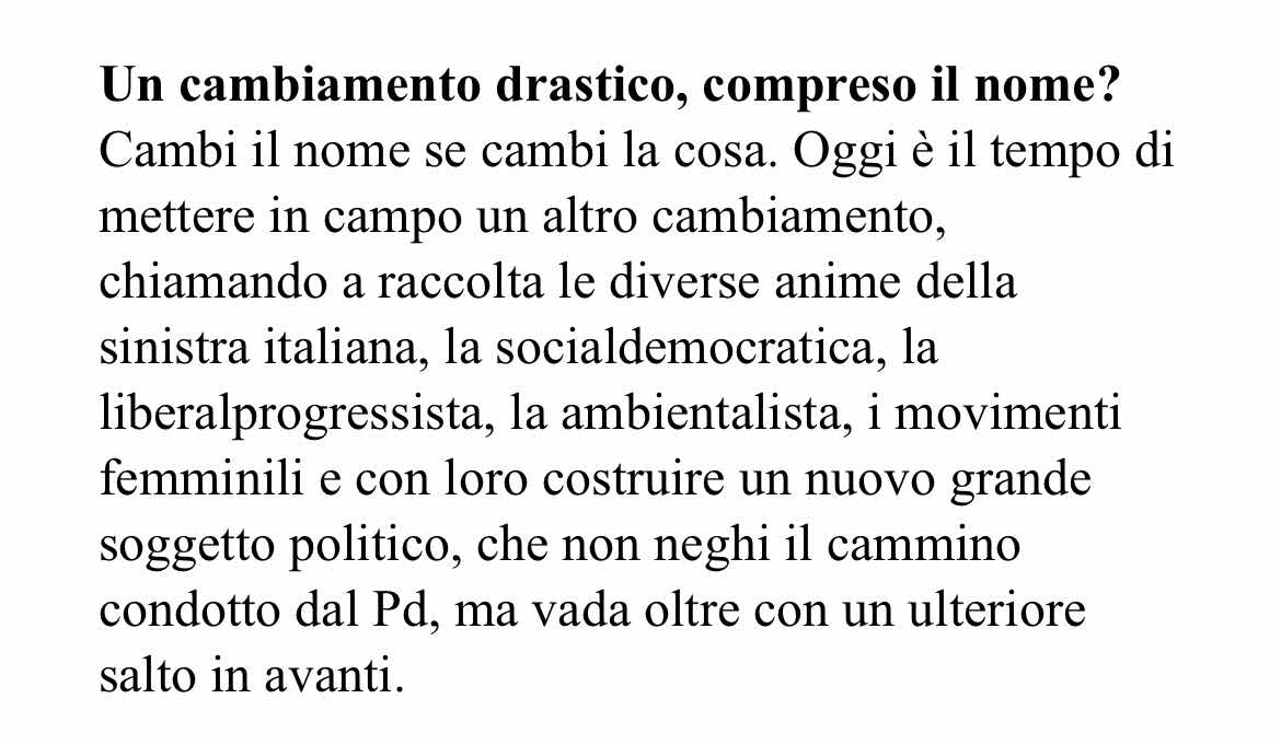Parole concrete, aria di rinnovamento, novità politiche, concretezza per un nuovo slancio riformista. Il PD sembrerebbe avviarsi verso il tanto sospirato cambiamento radicale che necessariamente deve partire da una nuova dirigenza, mandando speditamente a coltivare orti personaggi stantii, obsoleti, consumati da agi e spocchiosi atteggiamenti elitari. E queste parole chi le ha pronunciate? Un giovane militante? Qualcuno che è stato agevolato dalla gerontocrazia pidina la quale, consapevole che dopo stagioni sperperate in politichese arzigogolante e remunerate principescamente, sull’esempio del M5S, passerà finalmente la mano?