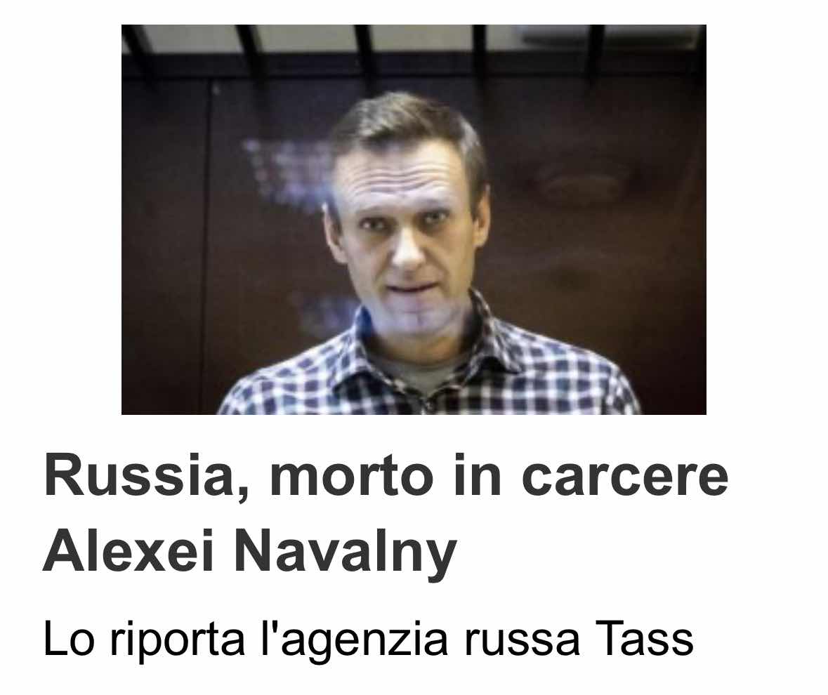 Alla fine l’assassino russo Putin, un tempo idolatrato dalle nostre macchiette politiche, ce l’ha fatta ad eliminare il suo nemico per antonomasia! Il prossimo sarà Assange, che se verrà estradato negli Stati Uniti, solo per aver svelato verità immonde, morirà in un carcere di massima sicurezza.