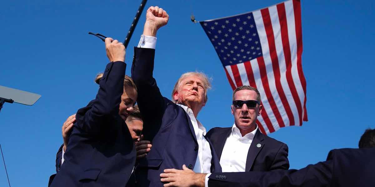 Sarà che quel che riguarda Donald Trump ha sempre un sentore farsesco oltre che canagliesco e delinquenziale, come se la sua figura, capace di muovere la plebe alla sedizione satolla di Capitol Hill, sfarfallasse continuamente tra il raccapriccio e lo scherzo carnevalesco di cattivo gusto, ma le immagini che lo ritraggono mentre si issa dopo essere stato colpito a un orecchio da un proiettile sono di ipnotizzante bellezza artistica. Se l’evento politico ha in sé, com’è scontato che sia, una potenza enorme, la stessa dei riti di passaggio e delle feste collettive (il candidato repubblicano che vincerà le elezioni è battuto da un cecchino ventenne che buca la sua sicurezza ridicolmente palestrata, addestrata, contundente), l’evento mediatico, con tutta la sua esorbitante semiologia, è spettacolare. La foto scattata subito dopo lo sparo dal fotografo Evan Vucci dell’Associated Press, premio Pulitzer 2021, non a caso immediatamente postata su X dal figlio Donald Trump jr., è una stupefacente esplosione di segni: Trump, forzato a muoversi dagli agenti del Servizio segreto che a stento lo spostano, si libera, si trattiene, si immortala, si tramanda; simile a uno dei Prigioni di Michelangelo, si fa simbolo congelato, icona, fermo immagine. Trump conosce la potenza delle immagini e sa che deve cogliere il kairos, il momento supremo e casualmente perfetto: ha tre rivoli di sangue sulla guancia destra, come un capo Apache, il cui rosso rimbalza sulle strisce della bandiera americana che sventola alle sue spalle, sulla sinistra; il pugno destro chiuso e alzato al cielo, come ha scritto il New York Times, suggella l’apice del “legame viscerale” coi suoi sostenitori.