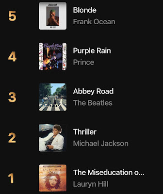 Al primo posto mettono "The Miseducation of Lauryn Hill"... - mannaggia come sono ignorante, mi son detto - uno degli LP rap più crudi e attuali di sempre, recita il commento... non ascolto questo genere, mai ascoltato, lo rifiuto, e allora? Al primo posto. Ma non è tutto: Thriller al secondo ci può stare - non l'ho mai ascoltato tutto per intero, per altre ragioni mie, forse un po' troppo settarie lo ammetto, come non ho mai visto un film né letto un libro di Pasolini, e potete capire perché, forse sbaglio ma in automatico escludo i tipi deviati e sono alla fine fatti miei - ma continuiamo! Al terzo ecco i Beatles con Abbey Road, poi Prince, Ana, Nirvana, Wonder ... mumble mumble... mi chiedo dove sia Ello... prima c'è Adele, la Swift, Jay-Z, Dr.Dre.... al 22mo posto ecco il Boss con Born to Run, Daft Punk subito dietro... oh ecco al ventottesimo posto, dicasi ventottesimo posto The Dark Side of the Moon, di Elli, si proprio loro, i Pink al ventottesimo posto... al 53mo invece ecco comparire i Rolling con Exile - al cinquantatreesimo posto - e poi non ho ancora visto i Queen, i Genesis, Lou ... esco dalla classifica maledicendo di esserci entrato.