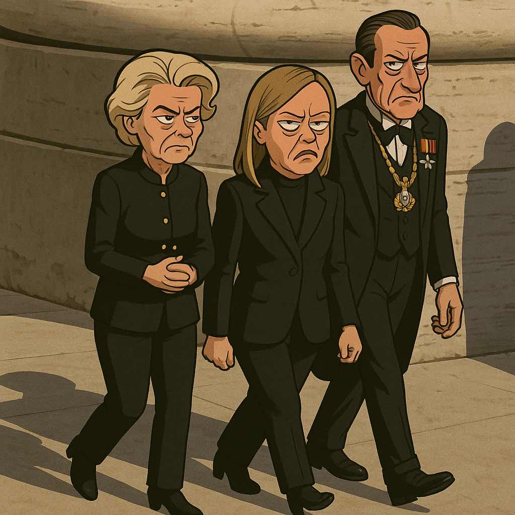 Dopo aver passato la notte a sgranare rosari, giaculatorie -San Giuliano fammi parlare col presidente americano- aver sguinzagliato i vari Sechi scodinzolanti, le due signore europee, una affamata e fremente di dilapidare 800 miliardi in armi, l’altra convinta di essere diventata l’ago della politica mondiale - ciao core! - si sono ritrovate un magro risultato in mano. Ursula un saluto alla “scusi mi si è fermato l’orologio, mi può dire che ore sono?” e Giorgia inseguendo Ciuffo Biondo con pennivendoli e ritrattisti al seguito è riuscita ad avvicinarlo in modalità “ahò ma tu non sei Geroni quello della 3C?”