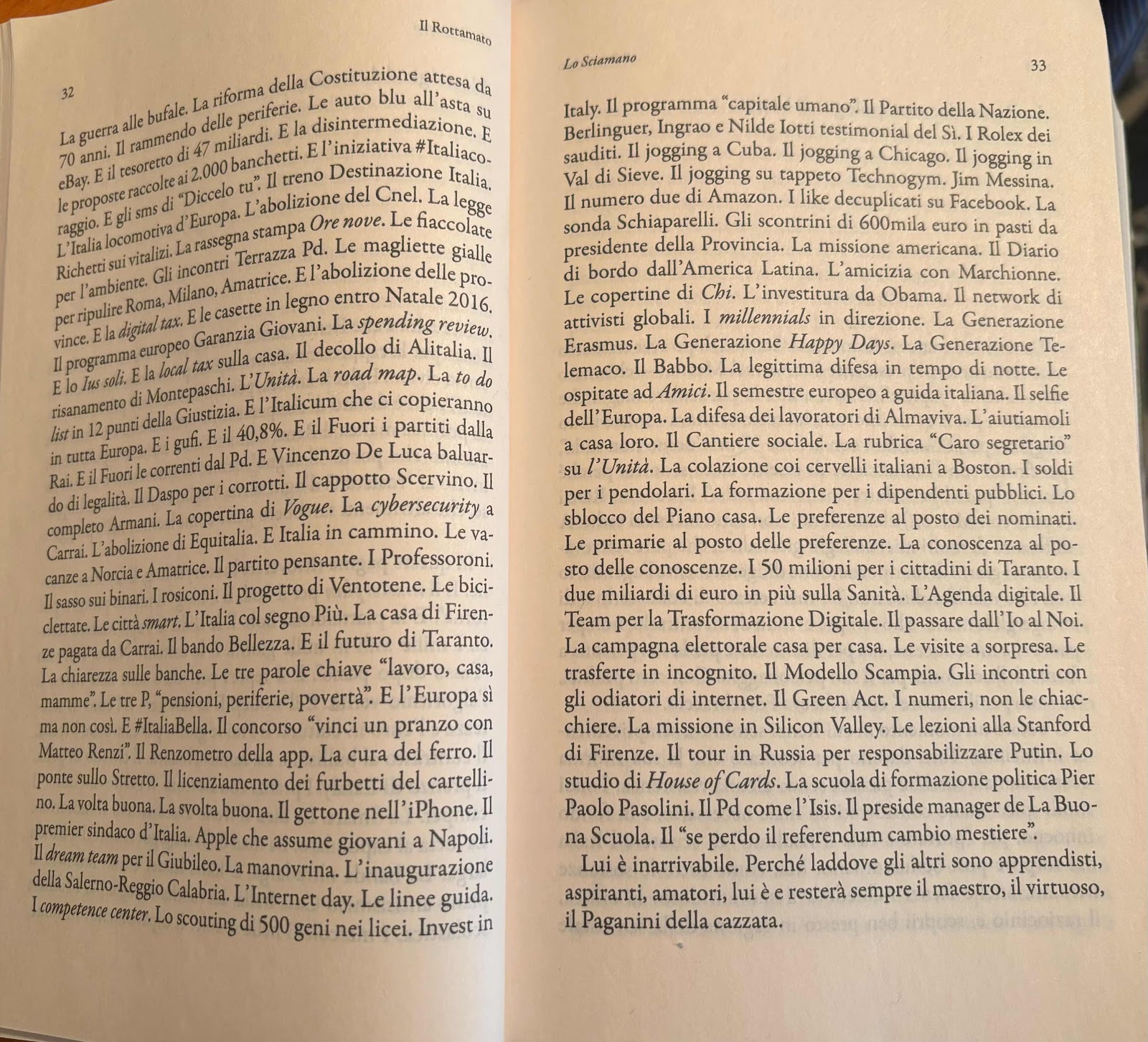 E lo Ius soli. E la local tax sulla casa. Il decollo di Alitalia. L risanamento di Montepaschi, L'Unità. La road map. La to do list in 12 punci della Giustizia. E l'Italicum che ci copieranno in tutta Buropa. E i guf. E il 40,8%. E il Fuori i partiti dalla Rai. E il Fuori le correnti dal Pd. E Vincenzo De Luca baluardo di legalità, Il Daspo per i corrotti. Il cappotto Scervino. Il completo Armani. La copertina di Vogue. La cybersecurity a Carrai. L'abolizione di Equitalia. E Italia in cammino. Le vacanze a Norcia e Amatrice. Il partito pensante. I Professoroni.
