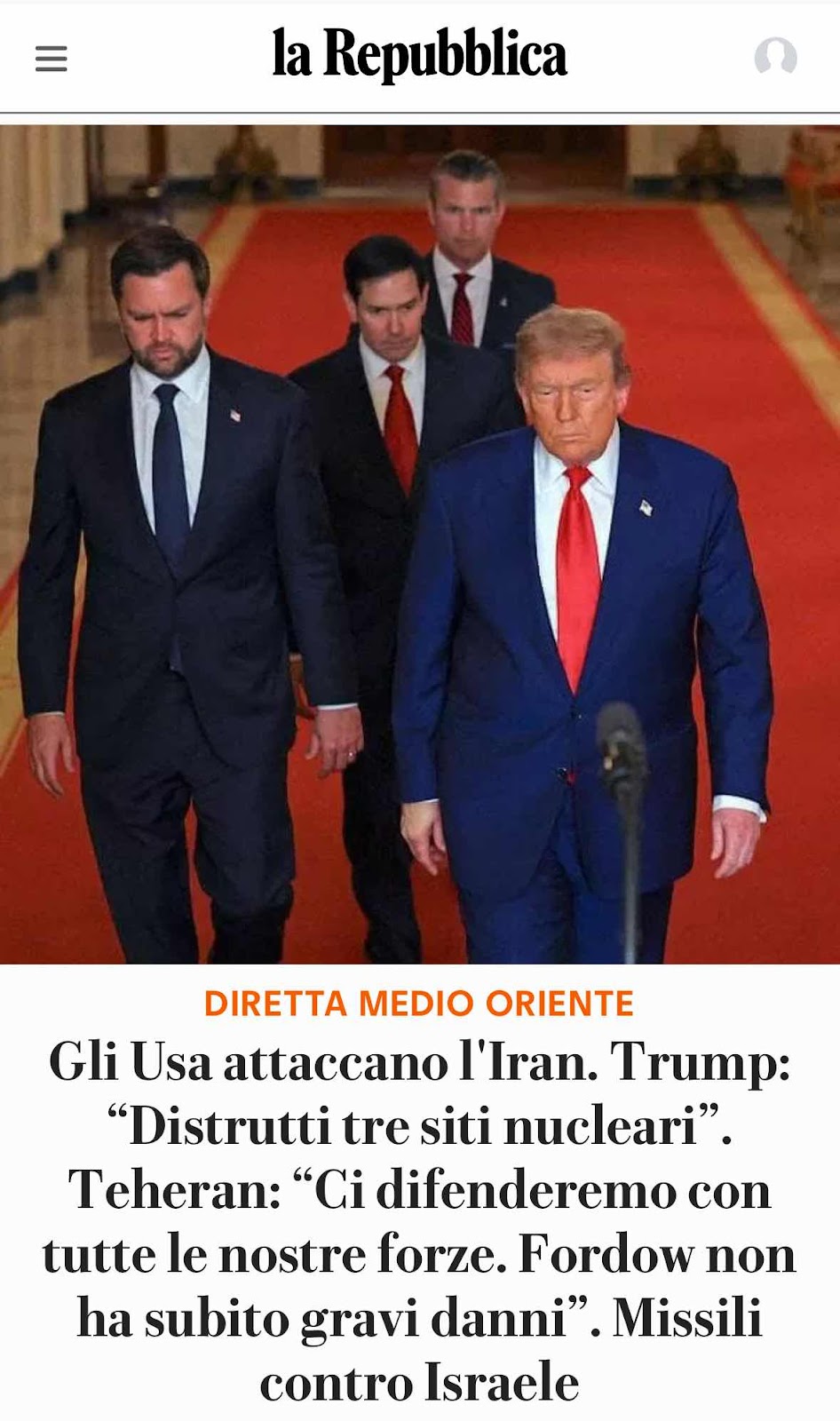 Eccoli qui, perfettamente in scala, i migliori rappresentanti della Politica del Rutto mondiale, affossante etica, dignità, buon senso: il primo è il bignami di ogni sconcezza morale, qualsiasi ve ne venga in mente, che sta inchiappettando un intero popolo, dedito ai bicchieroni di zuccheri, ai mega contenitori di grassi, alzando dazi e comprando azioni in picchiata, per poi riabbassarli e lucrare sull’aggiottaggio azionario, azione da galera questa, ma non per lui; dietro di lui un portasfiga - chiedere all’Argentino buonanima - ultracattolico tradizionalista, razzista, e per questo non cattolico, convinto, come tutti gli infoiati, di avere al fianco un dio rancoroso che faccia schiattare i poveri per agevolare gli ultraricchi, già salvo naturalmente; terzo il segretario di Stato che girava con una croce stampata in testa, per evidenziare la sua abnorme idiozia; e per ultimo il pericoloso responsabile della difesa, anti woke e anti nato, come mettere Paperoga capo della polizia di Paperopoli. Eccoli i migliori interpreti, i grandi padri della Politica del Rutto! Buona fine!